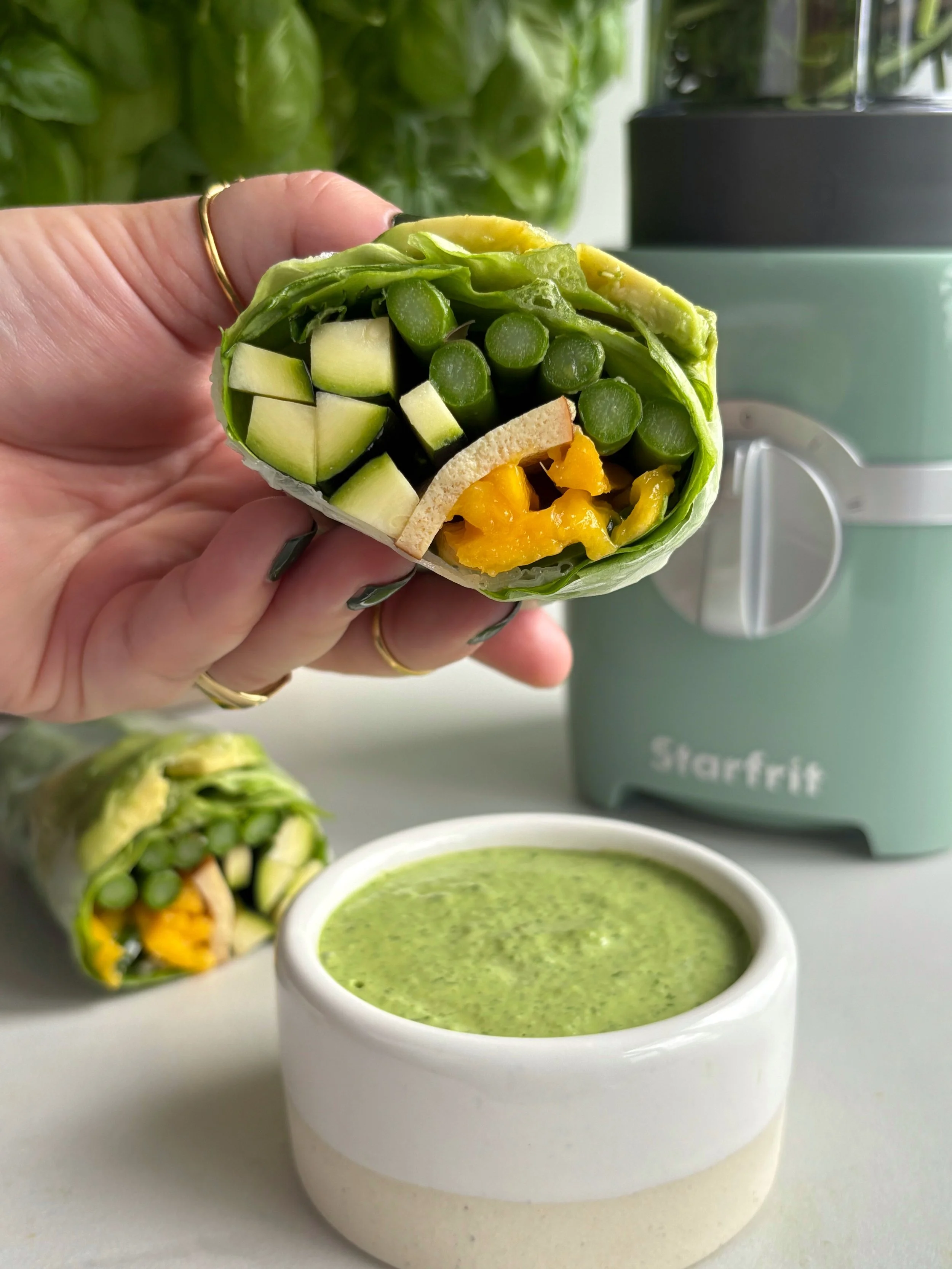 J’avais envie de plats tout vert tout frais pour l’été, alors j’ai eu l’idée de créer des rouleaux de printemps avec les beaux légumes de saison au Québec et une sauce verte au tahini et aux herbes inspirées de la fameuse vinaigrette Green Goddess. Ces rouleaux de printemps végétaliens sont croquants, frais et super nourrissants. Un must à essayer cet été!